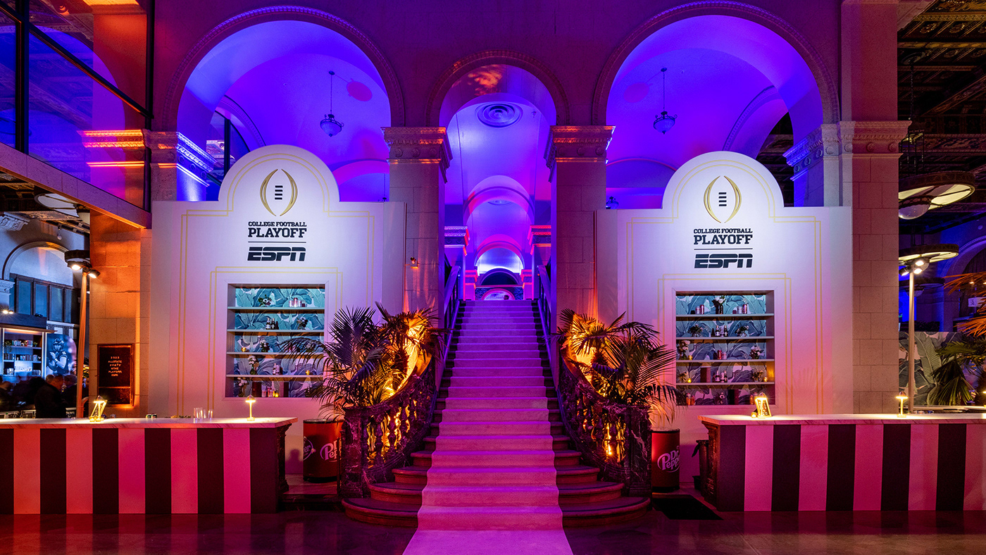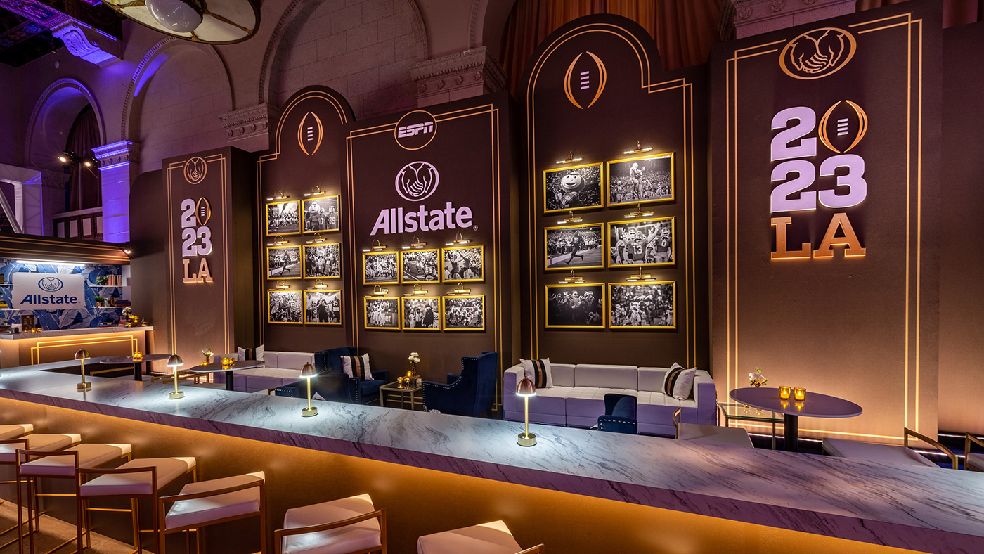 The annual event celebrates the best teams in college football leading up to the playoff's championship game. Allstate's Party at the Playoff signature blue carpet attracted press, athletes and influencers alike to Los Angeles’ iconic downtown. A Hollywood Regency style design complemented the venue's interiors of Majestic Theater, while incorporating past and present imagery from the two top teams. Design responsibilities included: Site Survey, Line Plans, 3D Renderings, Pitch Deck, Production Ready Graphics, Furniture Rentals with production oversight and execution.